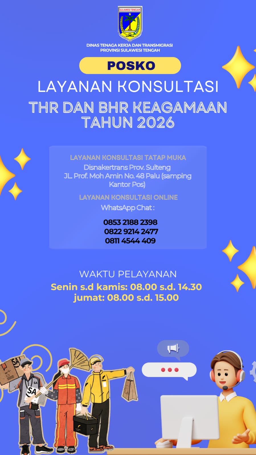 Layanan posko ini dibuka secara langsung di kantor Disnakertrans Provinsi Sulawesi Tengah serta melalui layanan daring guna memudahkan pekerja maupun pengusaha dalam memperoleh informasi dan menyampaikan pengaduan.